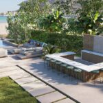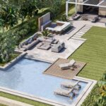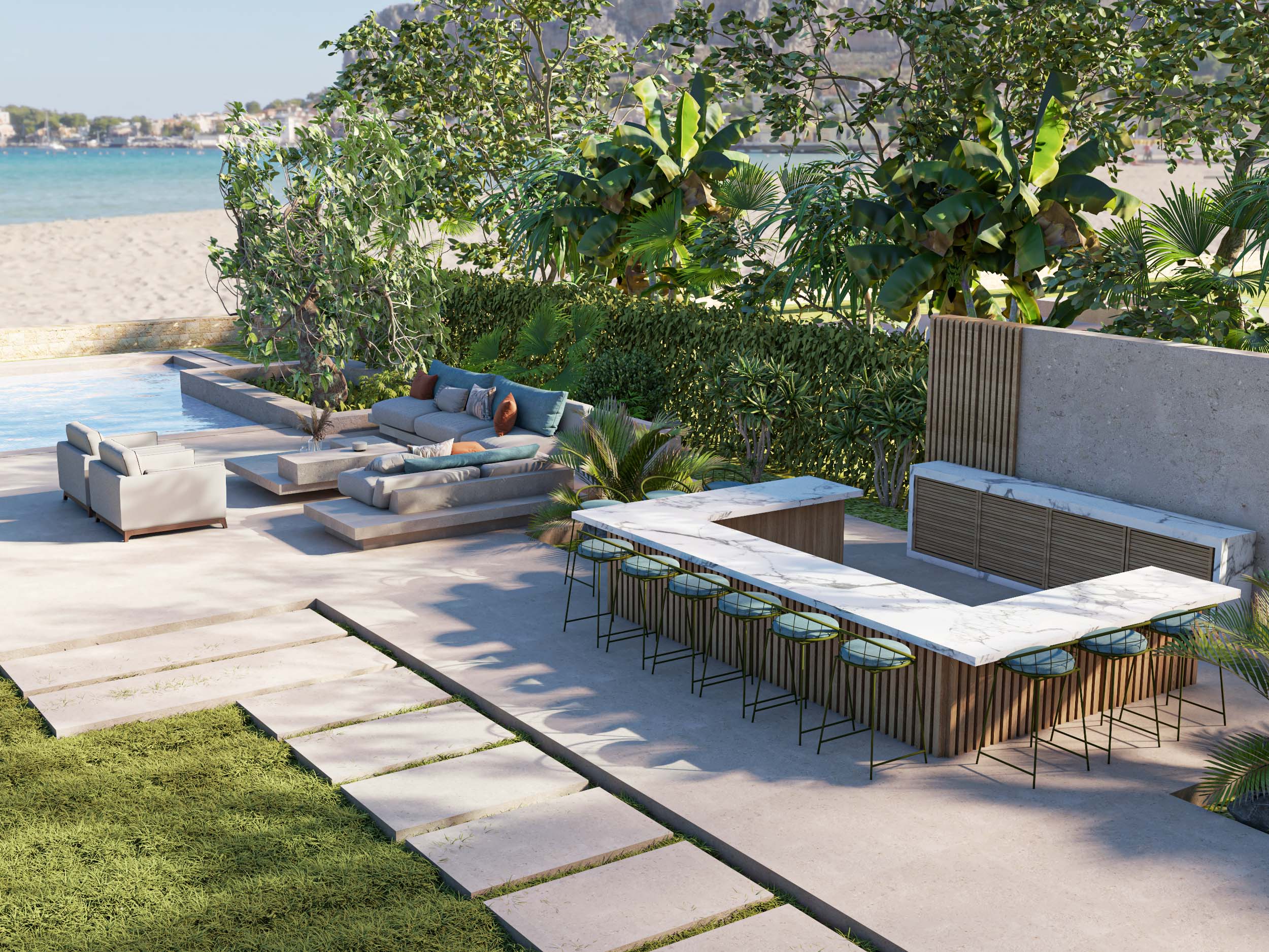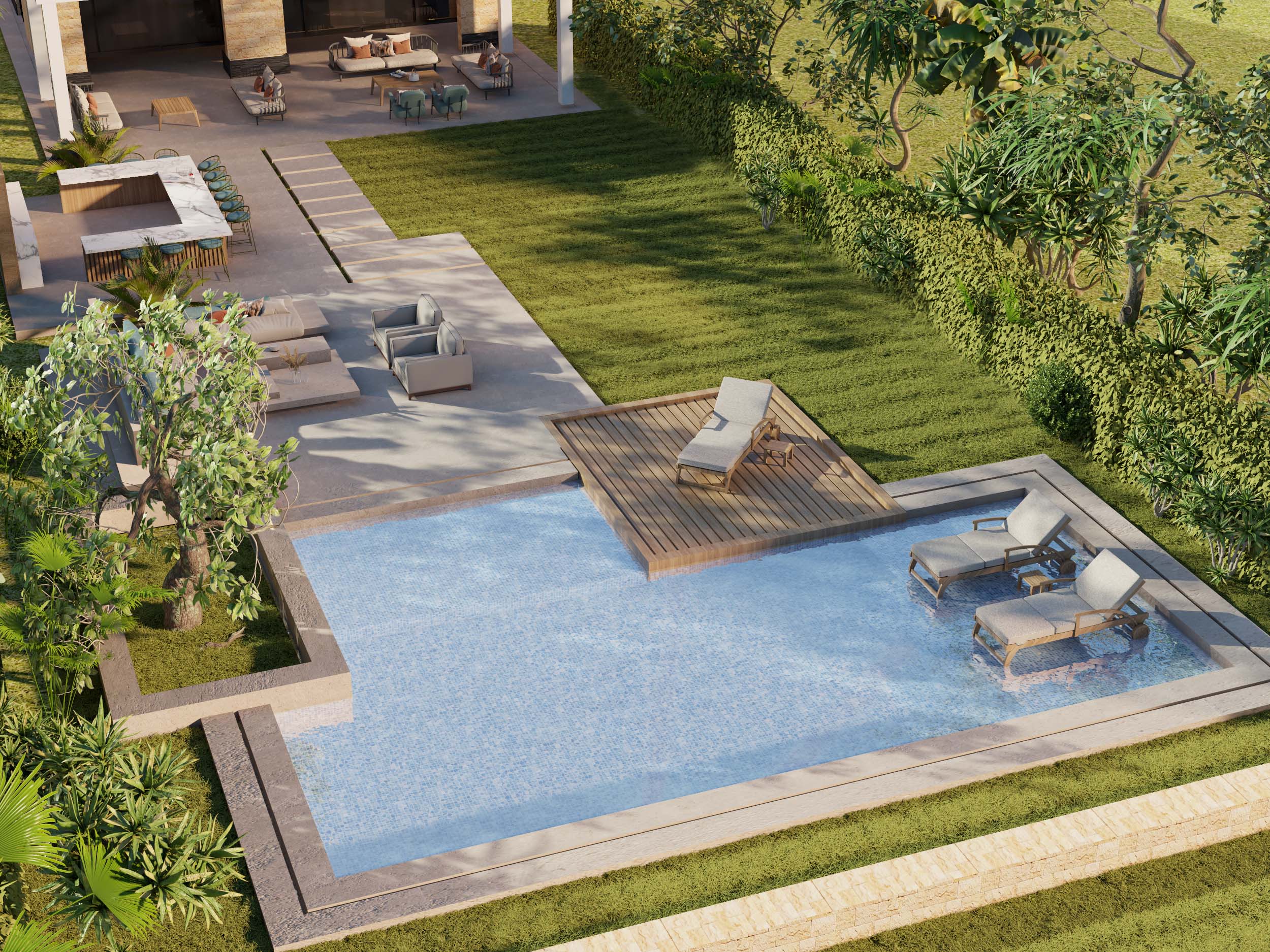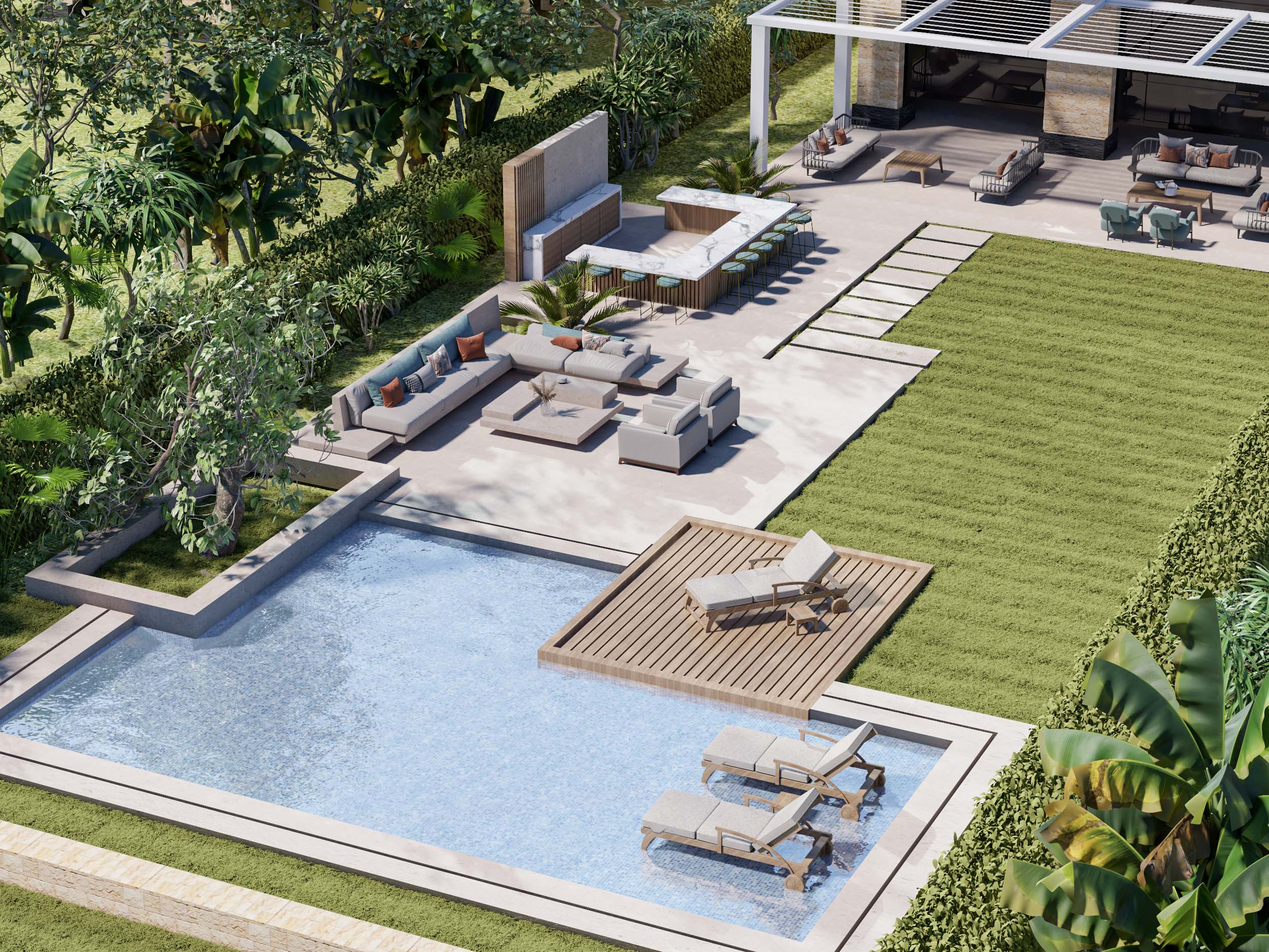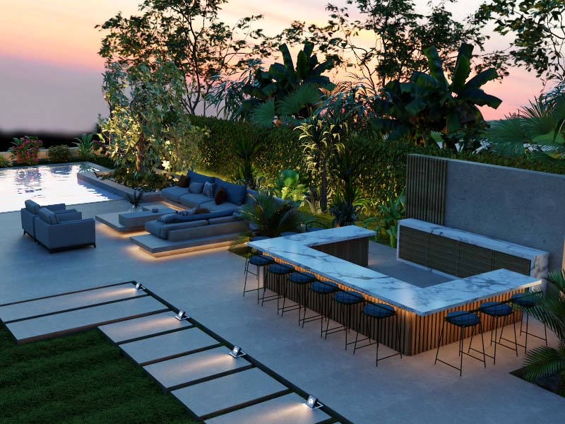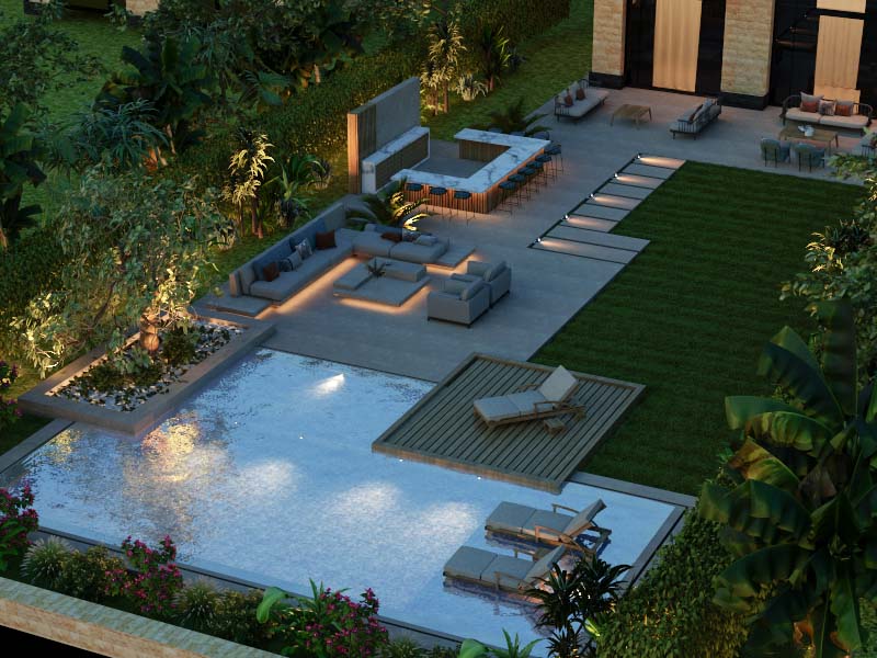 The brief for this project was to produce an entertainer’s delight, and we used different materials from Marble flooring to wooden decking within the swimming pool, coupled with a big breakfast bar with seating to delight the entertainer we offered exciting use of the landscape with the swimming pool, sunken lounge, and various design elements.