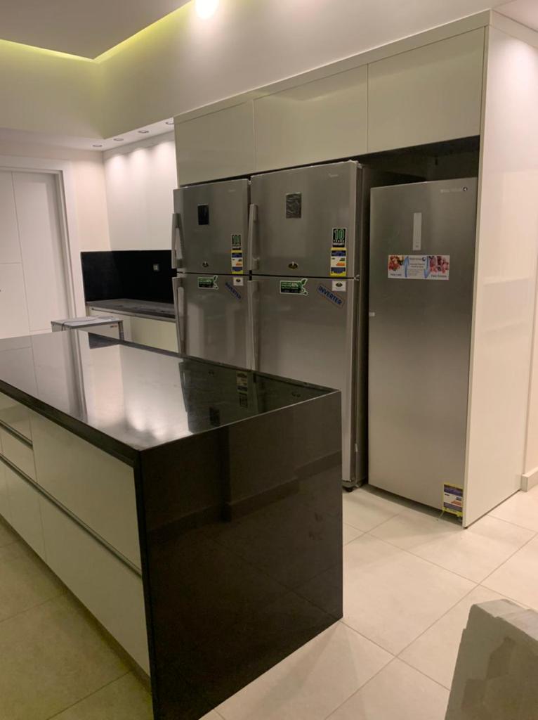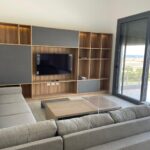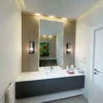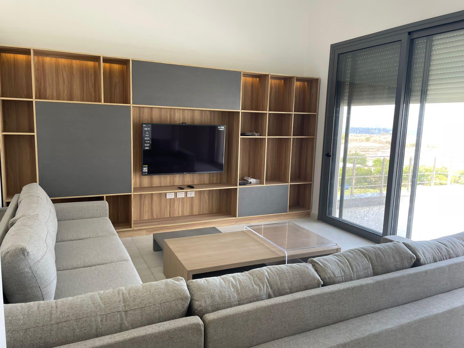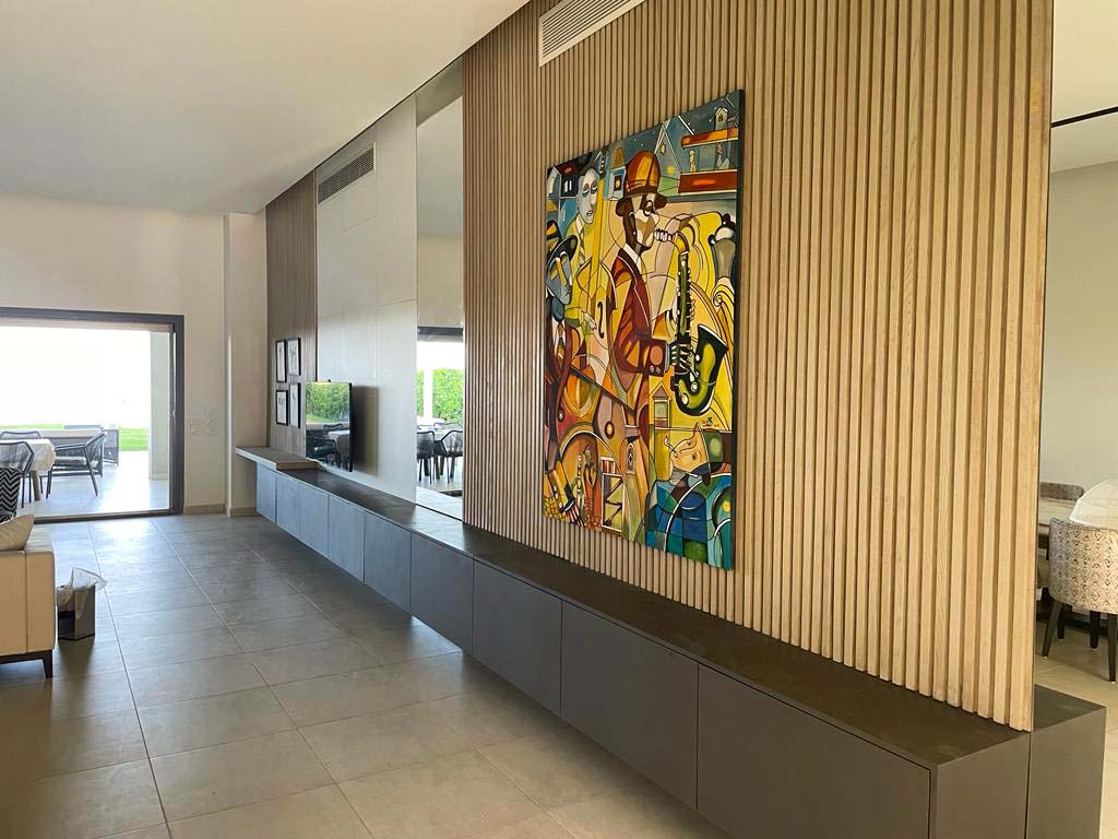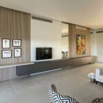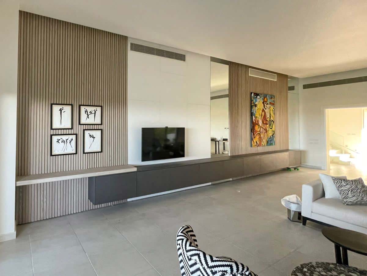 This design was focused on the use of the huge 11 x 4 wall in the primary living area. To achieve this, we used different types of wood and mirrors to give a modern design feeling.